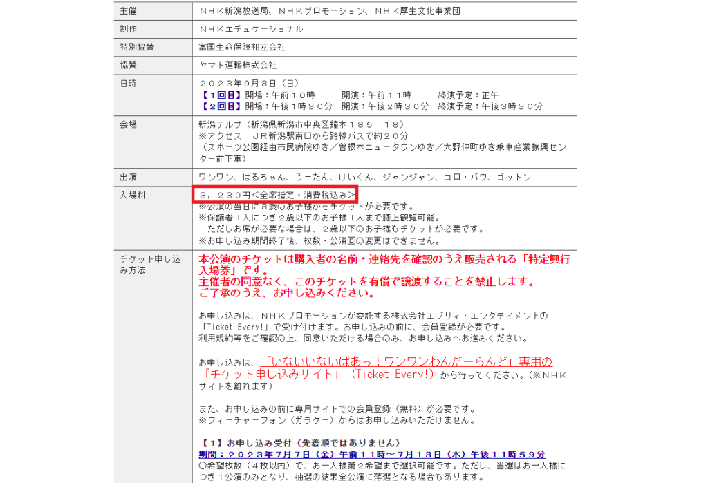「ワンワンわんだーらんど 新潟公演」チケット申込受付期間(抽選)